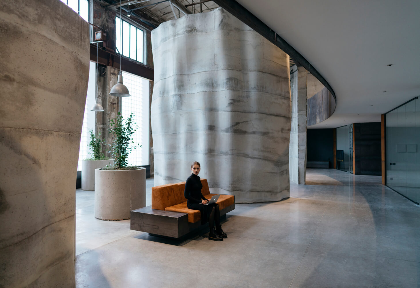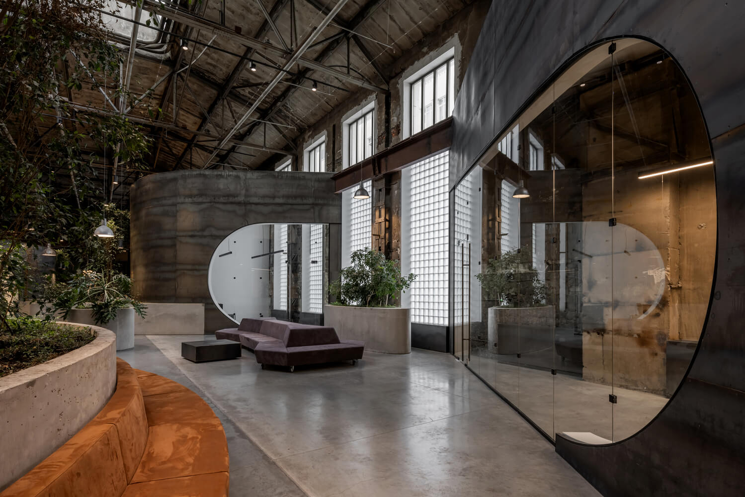 Стояла задача органично объединить под одной крышей офисы, торговые объекты, кафе, несколько общественных переговорных и коворкингов. Все это должно было уместиться в прямоугольном здании с характерным ритмом вертикальных пилонов, разделяющих оконные проемы, облицованные стеклоблоками.
