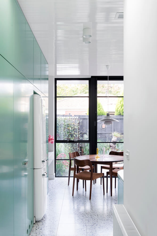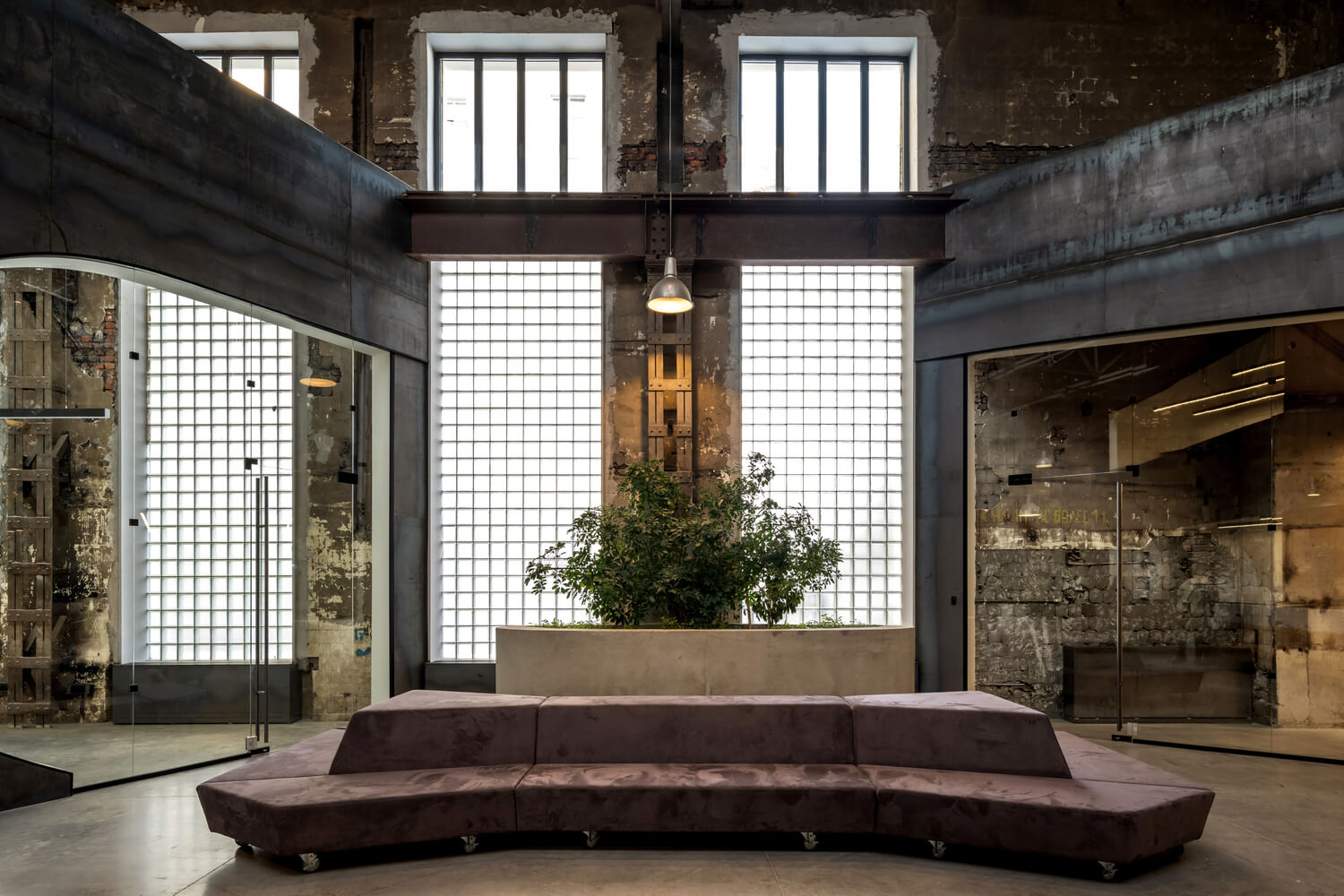 Стеклянные блоки заменили на современные, сохранившие первоначальный масштаб этих элементов, но вместо стекла зеленого цвета новые блоки полностью прозрачные, чтобы обеспечить отремонтированное пространство дневным светом.